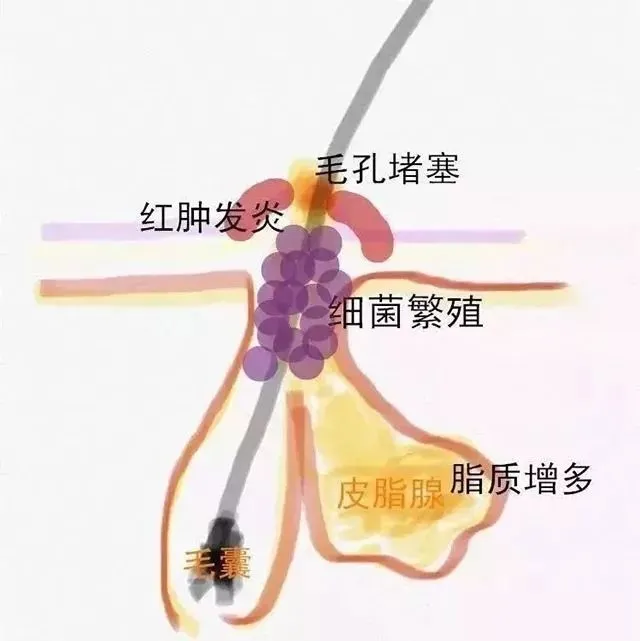 毛囊是个生产流水线,本来稳定产出适量油脂,顺畅地从管道输送到皮肤表面,用来起到保湿和防御外来侵害的作用。现在“产量”高了“运输能力”差了,产品就堆积起来,终于把车间门给堵上了。