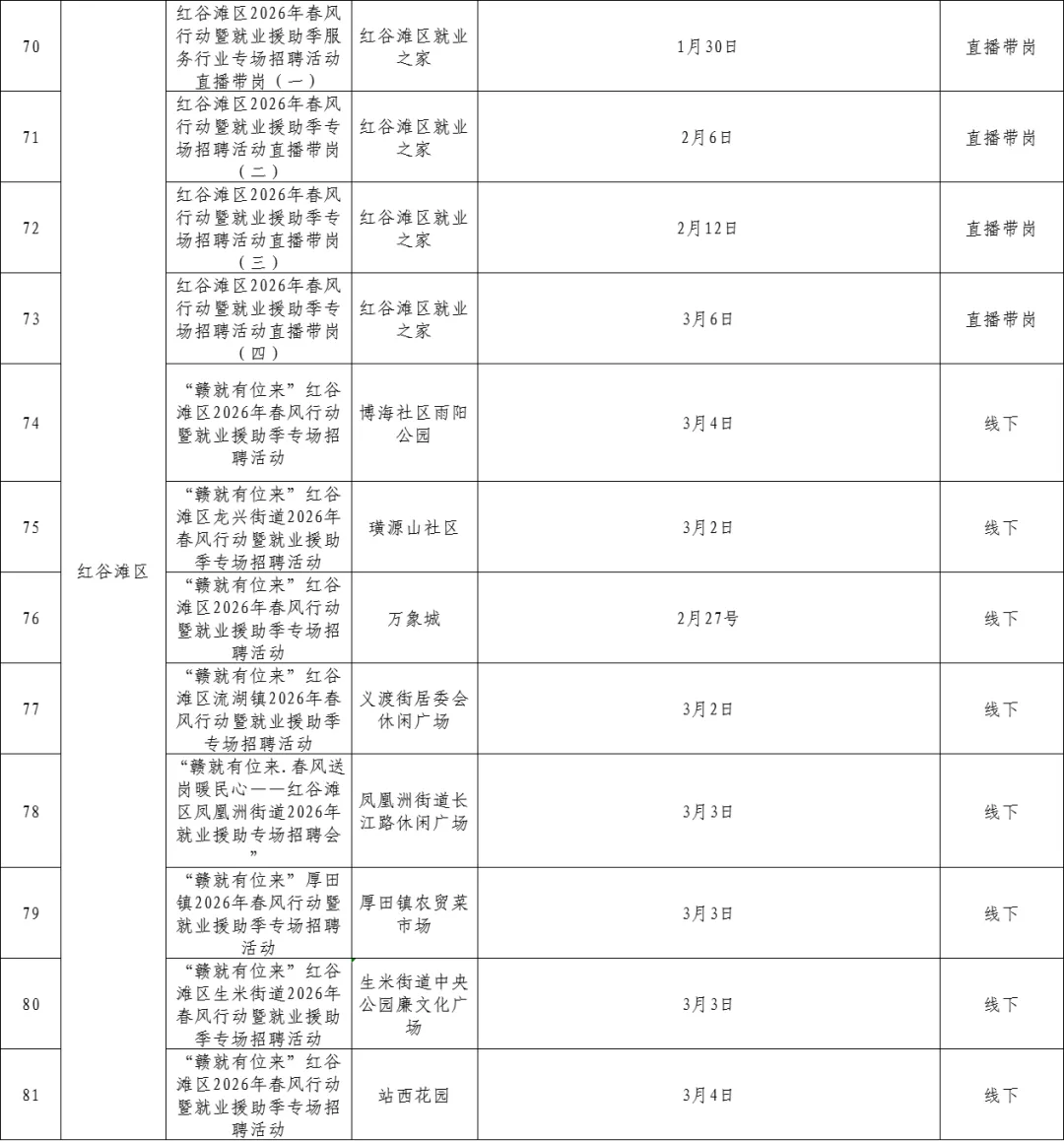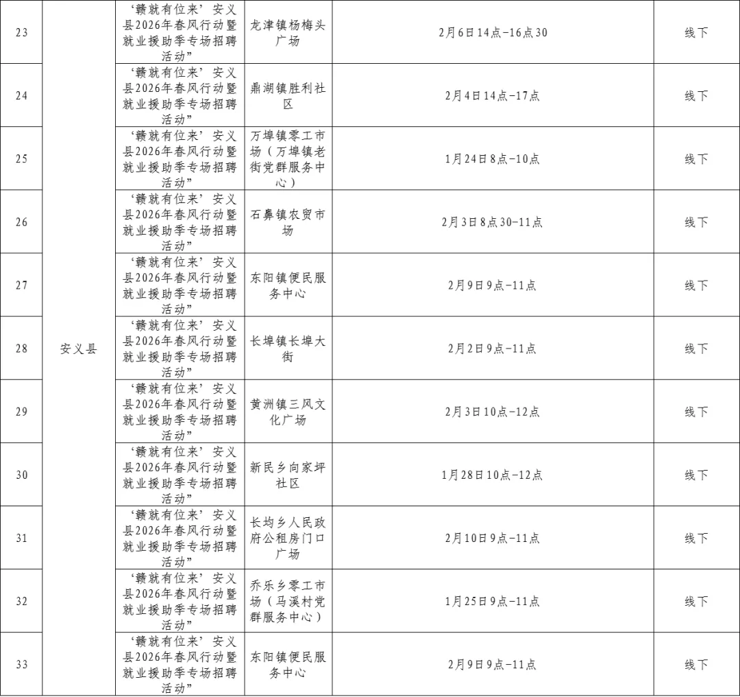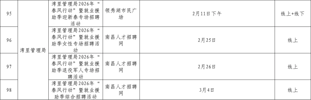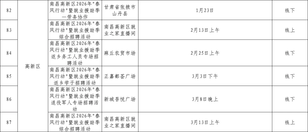 【编者按】2026年春风行动暨就业援助季活动正式启动,活动以“春风送岗促就业 真情相助暖民心”为主题,围绕返乡就业帮扶、城镇失业援助、灵活就业支持、农村劳动力多渠道就业、创业扶持五大专项行动,推动岗位推介与就业服务深度融合、协同发力,为各类劳动者和用人单位提供精准高效、暖心贴心的全周期就业创业服务。为及时传递岗位信息、全方位展现活动成效,江西人社特开设《春暖助团圆 春风促就业》专栏,持续聚焦各地春风行动活动安排和动态,敬请关注。