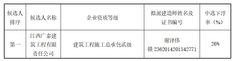 现初步确定排序第一的江西广泰建筑工程有限责任公司为中选单位。