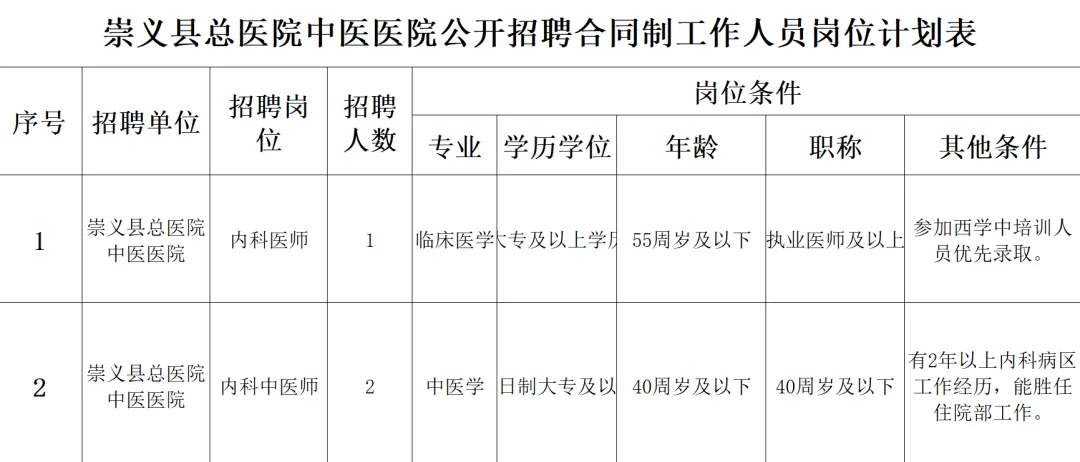 1.岗位招聘条件详见《崇义县总医院中医医院公开招聘合同制工作人员岗位计划表》。