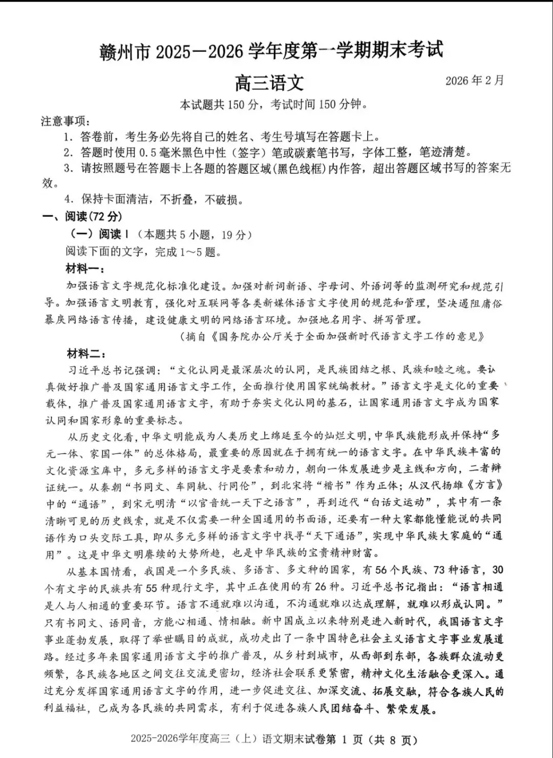 联考名称:赣州市2025-2026学年第一学期高三期末考试