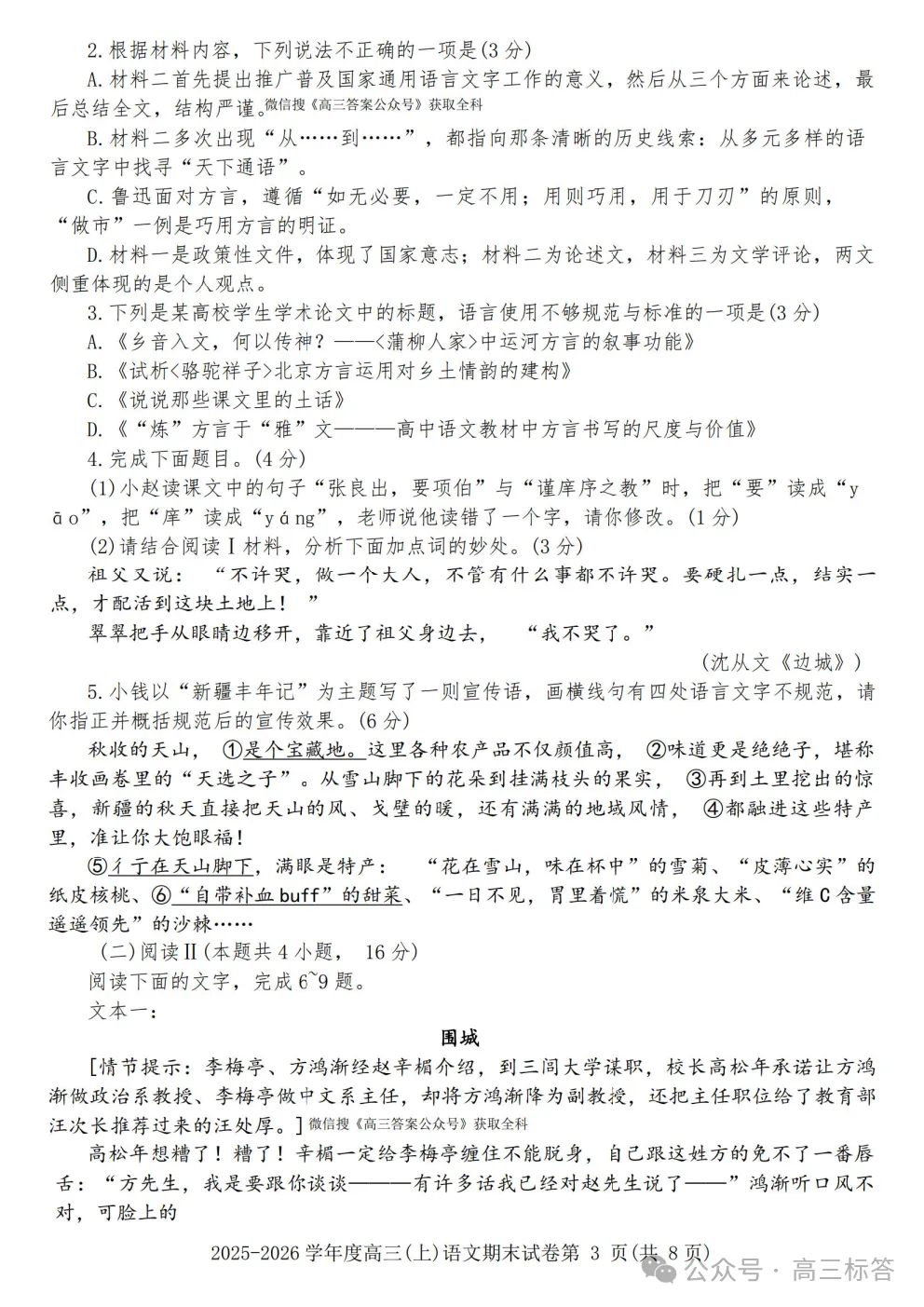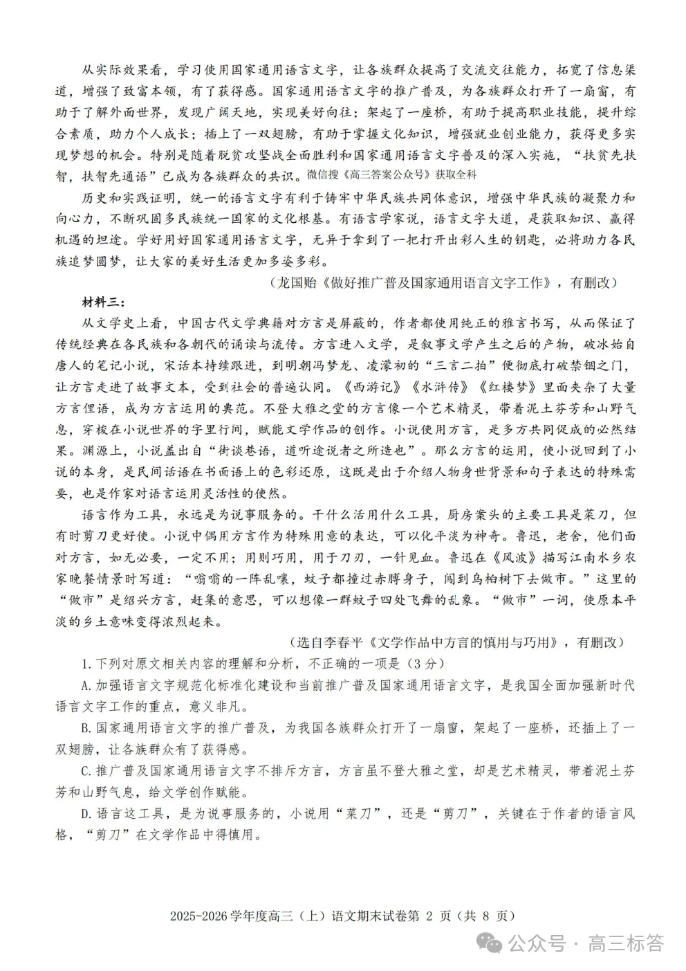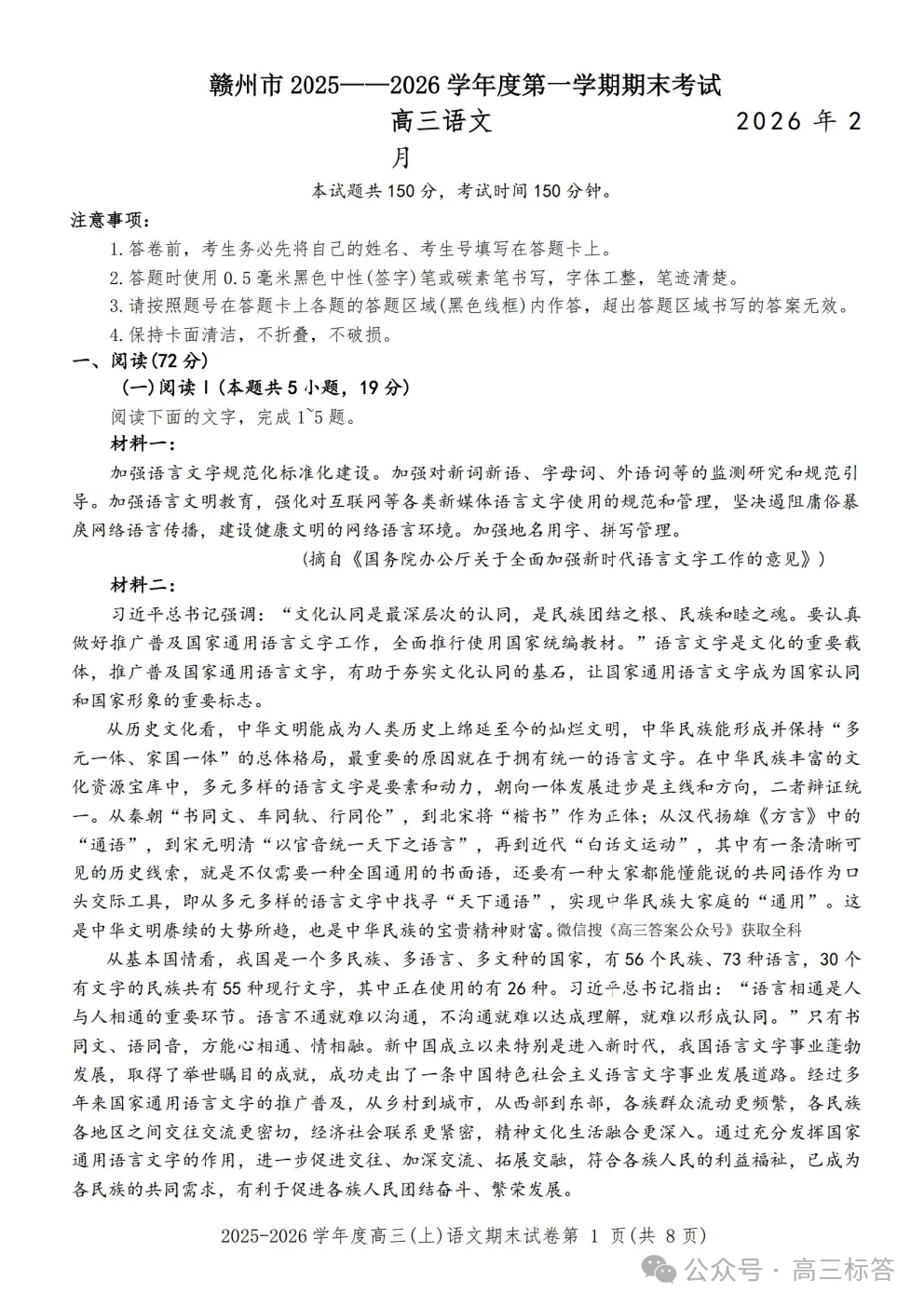 >赣州市2025-2026学年度高三期末考试【语文物理历史完整版答案pdf电子版】
