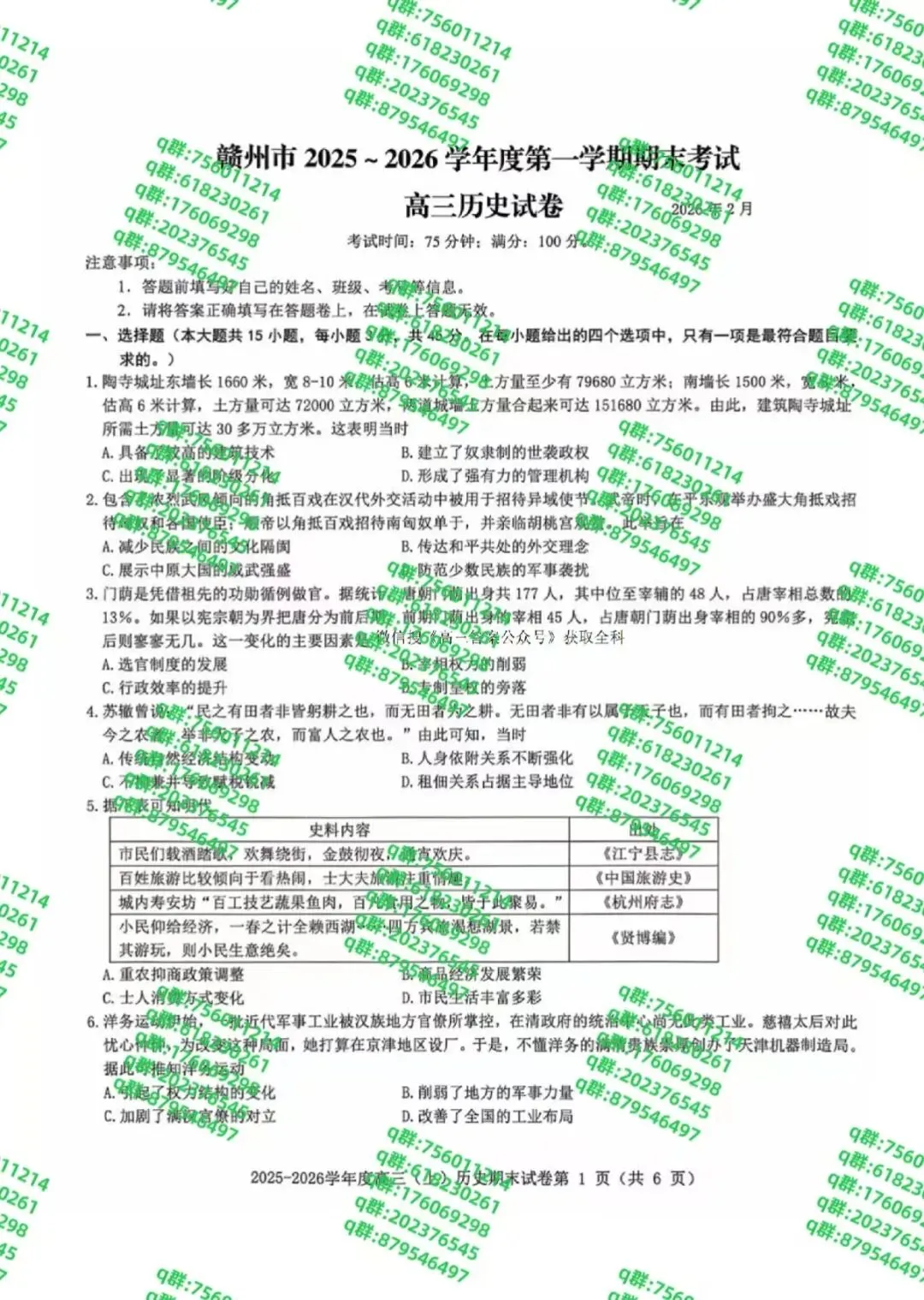 【赣州市高三期末考试】赣州市2025-2026学年第一学期期末考试全科答案解析汇总