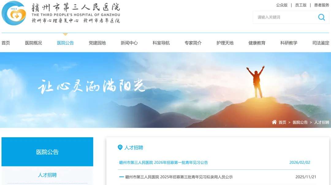 赣州市第三人民医院建院于1964年,是集医疗、科研、教学、预防功能于一体的三级甲等精神专科医院,是服务本地区并辐射赣、粤、闽、湘周边地区的心理康复中心,提供覆盖青少年儿童、中青年、老年全人群、全生命周期精神心理疾病的药物治疗、心理治疗、物理治疗、康复治疗、中西医结合治疗等多元化健康服务,是赣州市首家挂牌成立的公立老年医院,是江西中医药大学研究生教育创新基地,赣南医学院、赣卫职院的临床教学及实习基地,全省首批通过的省级群众满意医院、全省医德医风示范医院。
