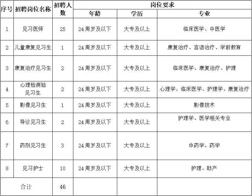 因医院发展需要,现招募高校毕业生46名参加就业见习,具体要求如下: