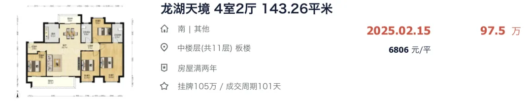 2025 年以来,随着价格的下探,龙湖天境二手市场热度有明显提升,有房源挂牌 36 天就火速成交。统计了下,去年全年单贝壳成交了 6 套房源,比旁边的阳光城翡丽湾、正荣华润悦蓉府都要多。
