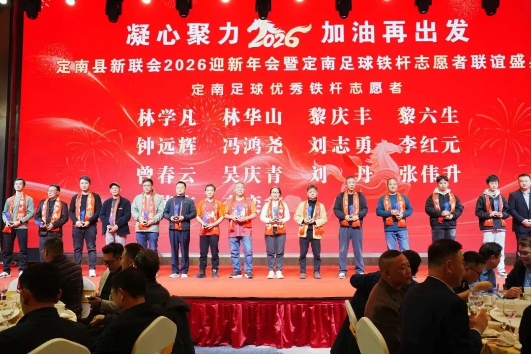 岁序更替,华章日新;暖意盈怀,绿茵情牵。值此2026新年将至、嘉节启幕之际,赣州虔城球迷协会与赣州青年球迷联盟受邀赴约,于2月1日共聚定南,出席定南县新联会2026迎新年会暨定南足球铁杆志愿者答谢晚会。这是一场因球结缘的热爱集结,一次致敬初心的奉献礼赞,更是赣定两地足球情谊山海相依、薪火相传的温暖延续。