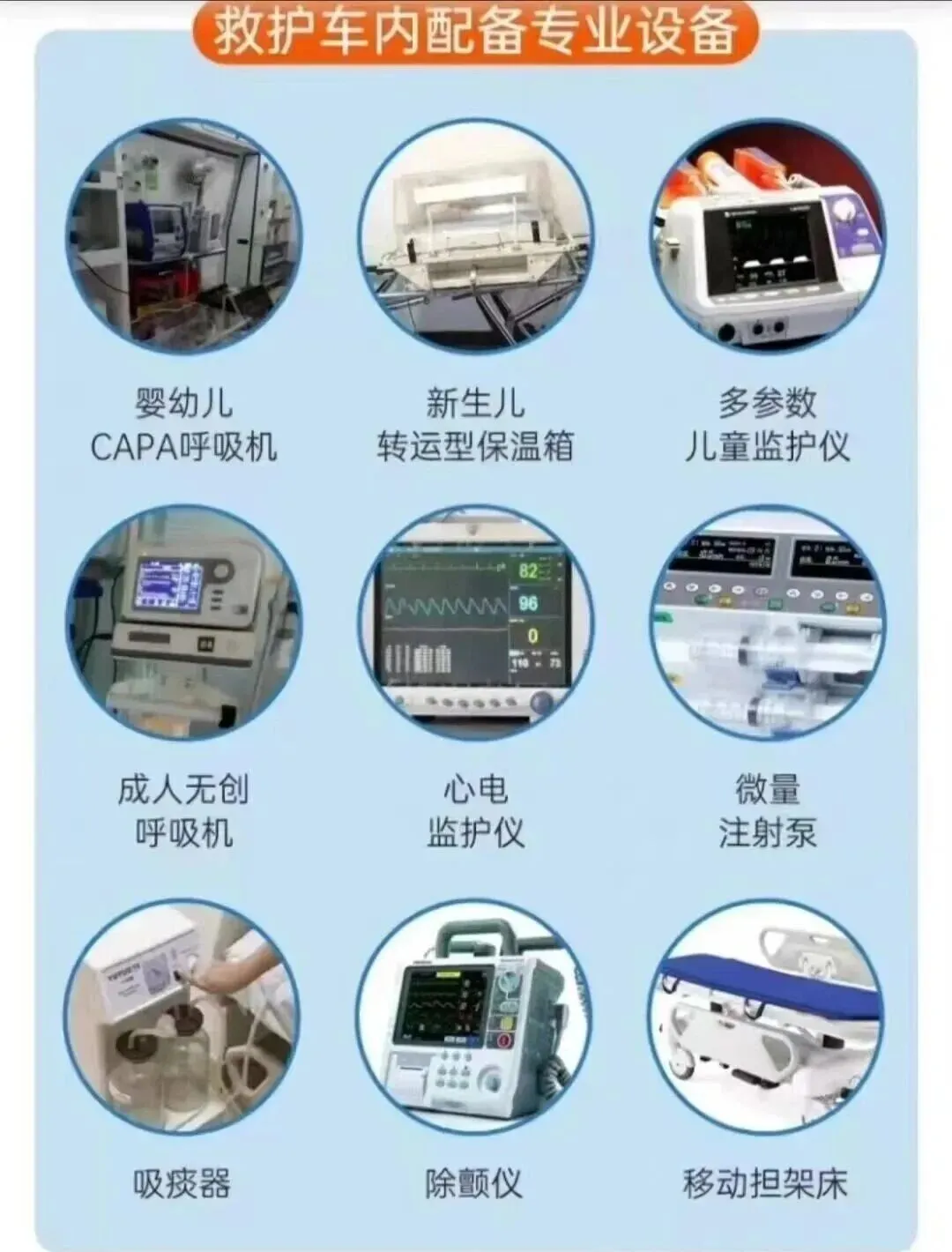 - 配备 负压监护型救护车,搭载呼吸机、除颤仪、心电监护仪等ICU级设备,满足重症患者转运需求。