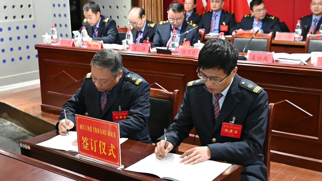 段长吴仕凤、工会主席张卫东分别代表行政方和工会方,签订段贯彻《中国铁路南昌局集团有限公司集体合同》协议书。