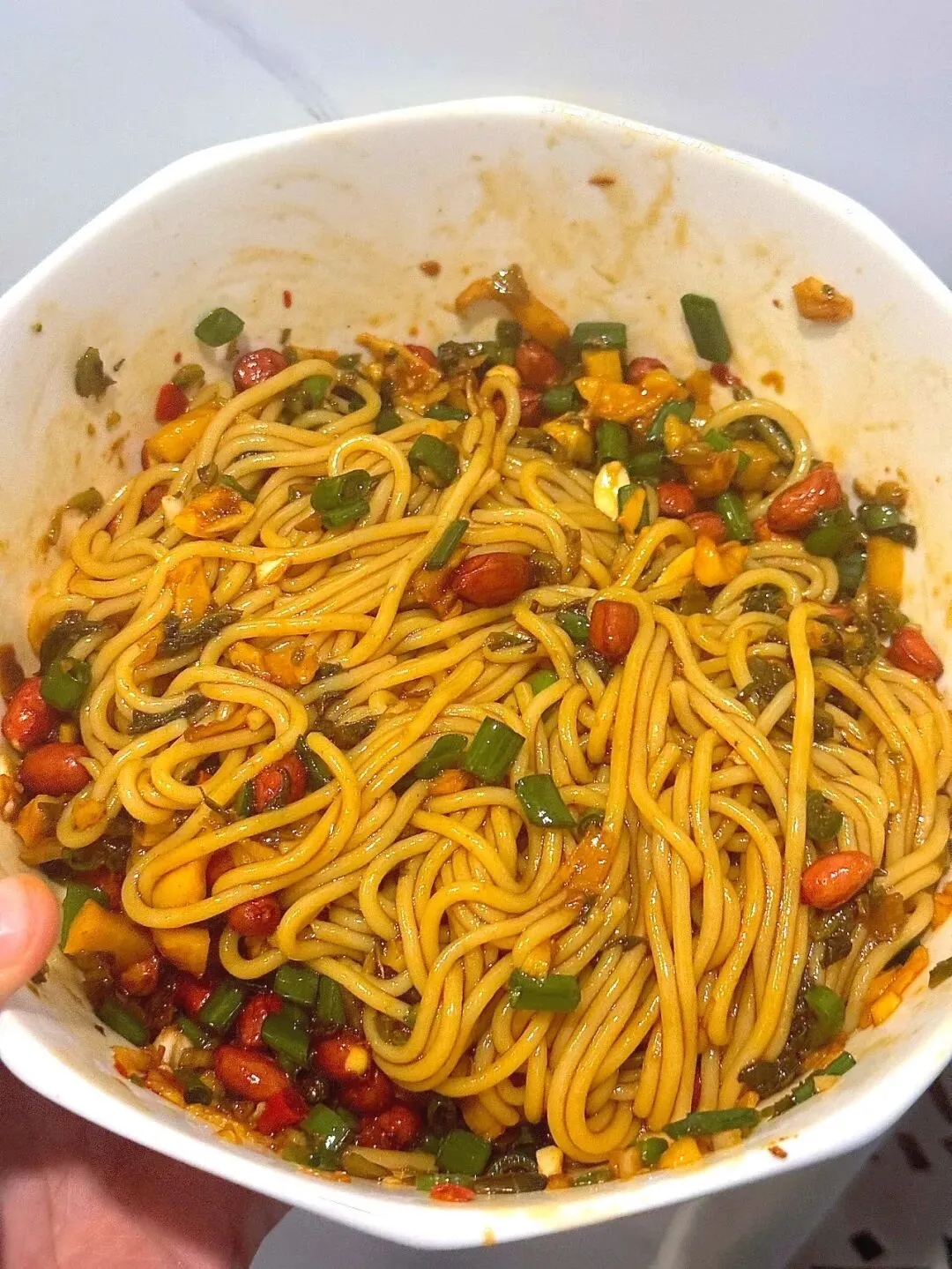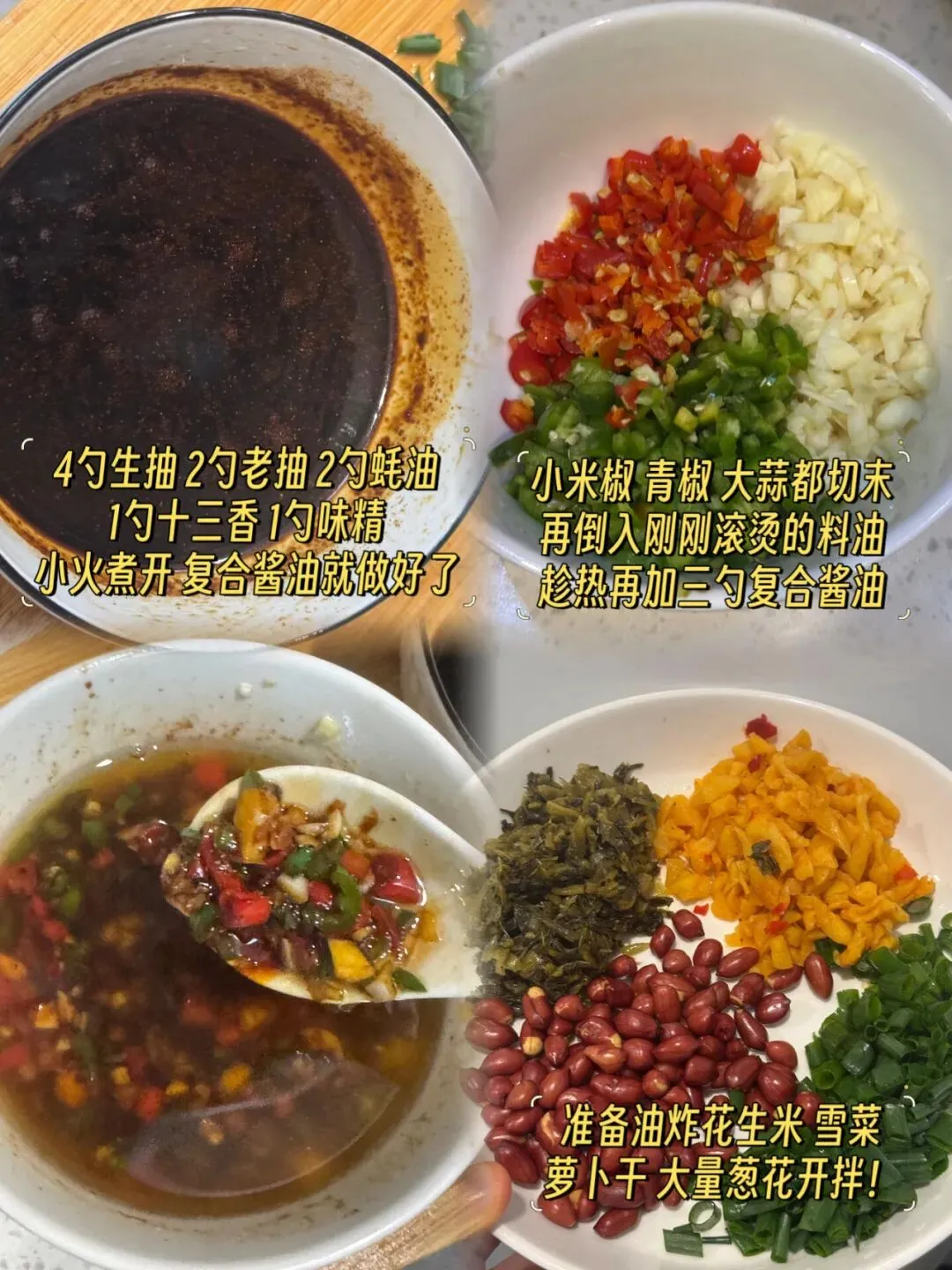 然后,请开始豪迈地加入你的爱:油炸花生米、脆爽的雪菜、咸香的萝卜干,以及大量的葱花
