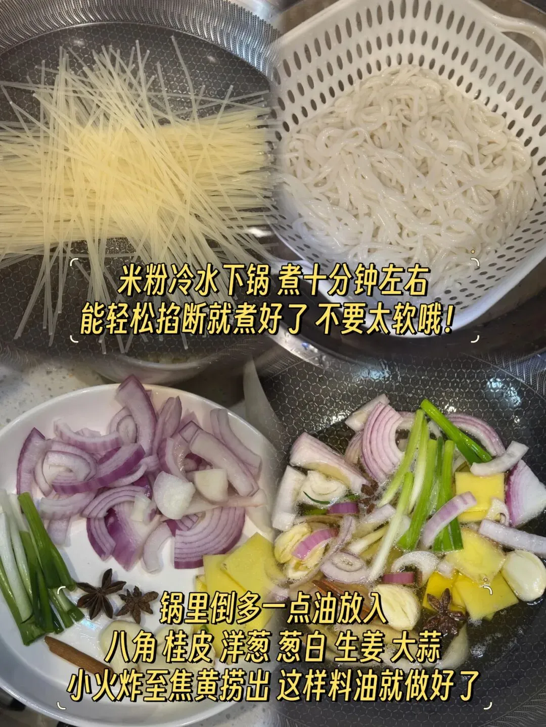 同时,另一边开始制作灵魂料油:锅中多倒些油,放入八角、桂皮、洋葱、葱白、生姜、大蒜,用小火慢慢炸至所有香料焦黄后捞出