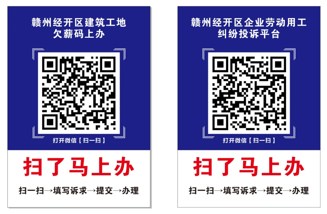 (一)一般性的拖欠工资事项,准备好相关证据材料后可直接扫码向赣州经开区综合执法大队举报投诉。