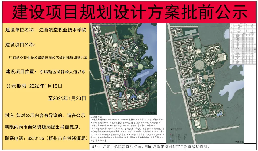 根据公示显示,此次调整后主要内容为:学校招生规模由3万人缩减至2万人,预计2028年升格本科后维持2万人规模。学校用地面积从1543亩缩减至1306亩,学校通过建设江航南城实训基地(抚州南城机场)补足用地需求;学校总建筑面积由109.84万平方米减少至66.11万平方米,容积率由0.99降至0.7。