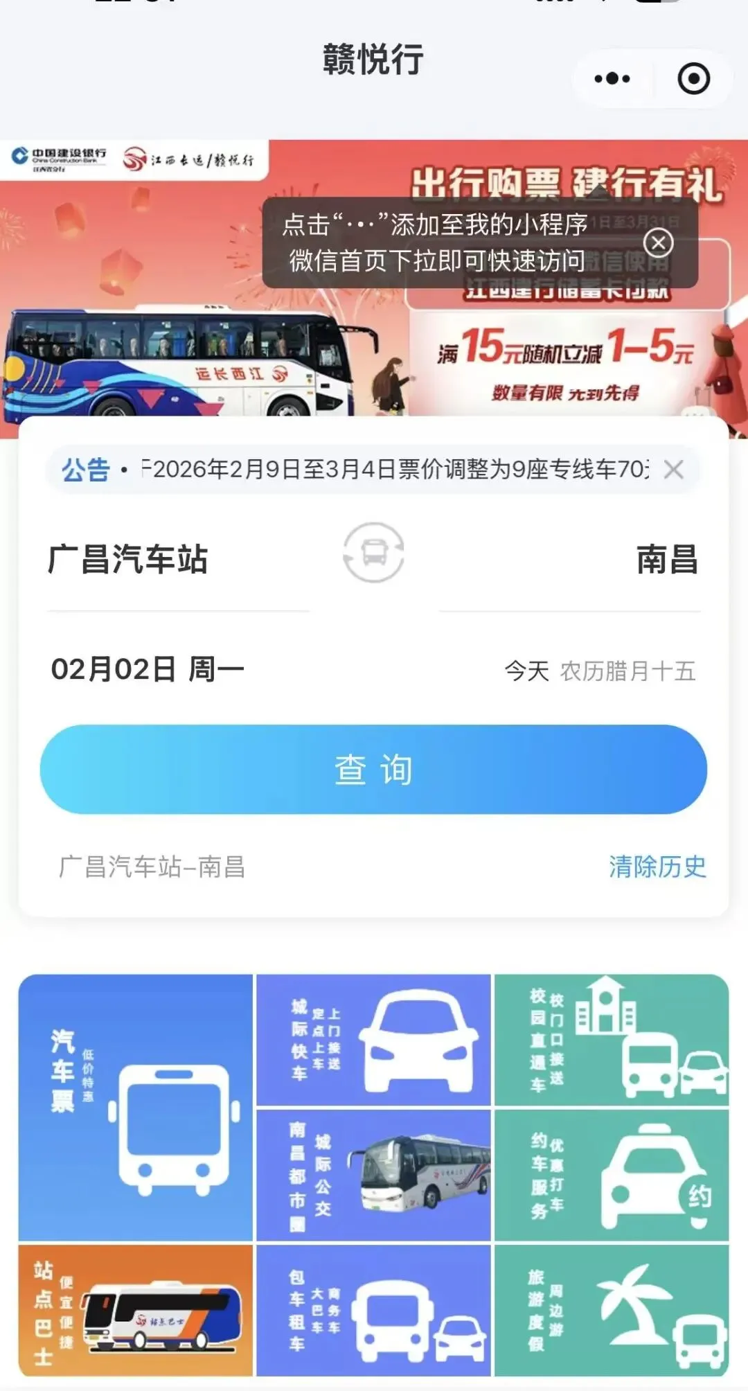 购票方式:旅客可通过微信小程序“赣悦行”完成购票,流程简便:输入出发地与目的地,选择出行日期及班次,选定就近上、下车点后即可一键预订,电子车票凭二维码核验乘车。