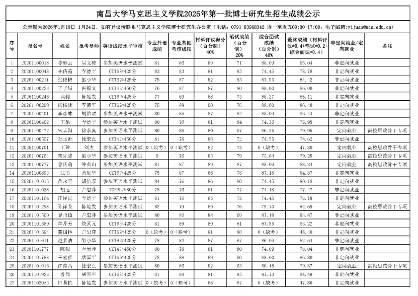 南昌大学马克思主义学院2026年第一批博士研究生招生成绩公示