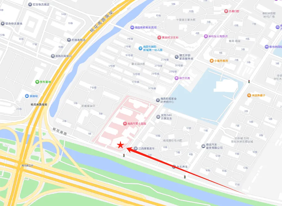 来院方式:①.乘坐公交259路至园常寺路云卿路口(公交站)下车即到医院侧门;②.乘坐地铁4号线至丁家洲站1号或4号出口下车,步行15分钟到云卿路789号南昌市第七医院(朝阳院区);③.驾车前往,院内免费停车。