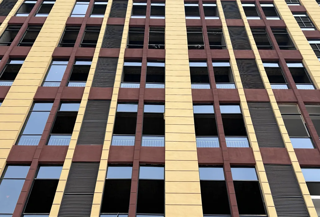 目前,项目外立面装饰已全面完工,建筑主色调为明亮的高饱和浅黄色,底层采用沉稳的灰白色,局部以深棕色点缀,视觉层次分明。