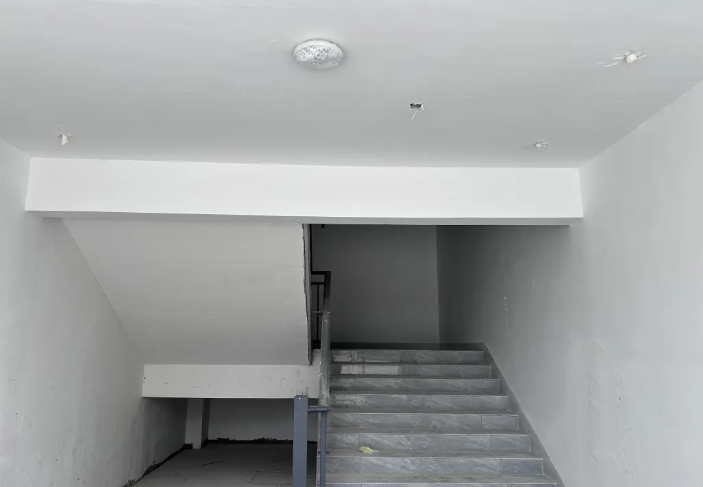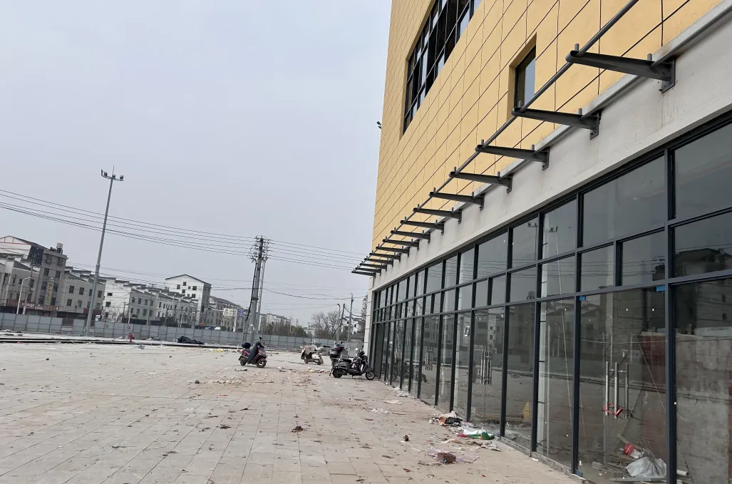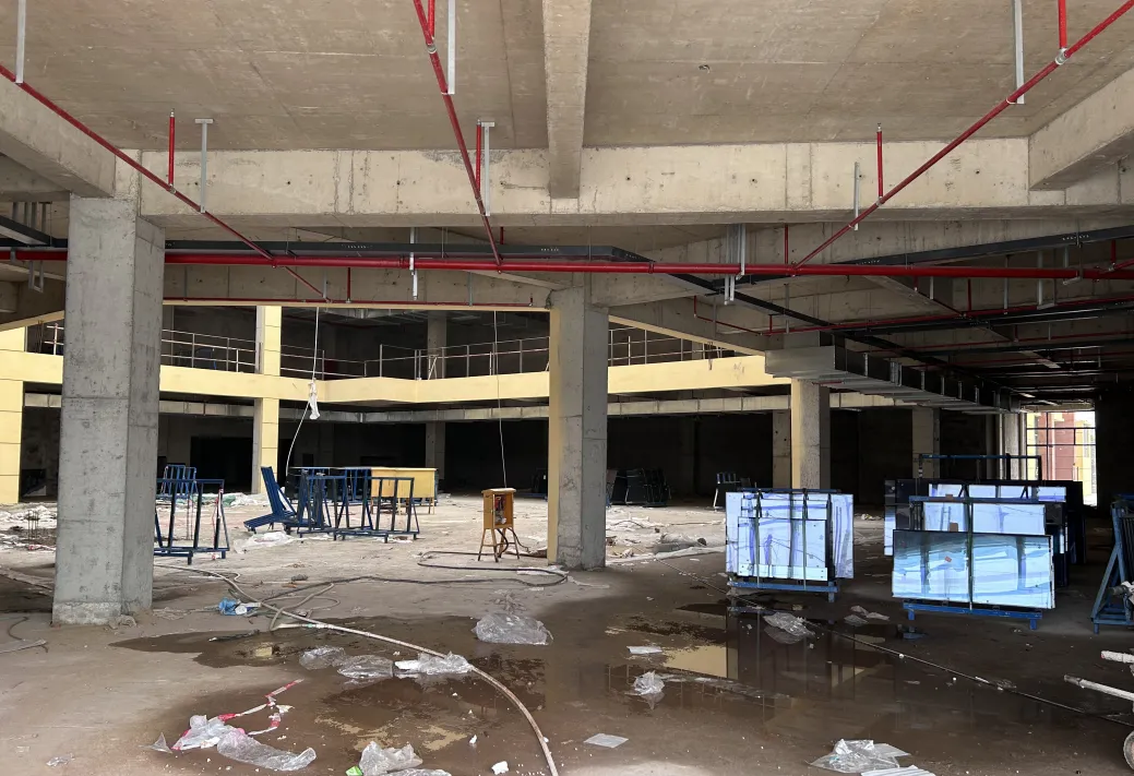 透过门窗可见,办公楼内部装修已完成,楼梯护栏等设施均已就位;邻里广场内部多数区域尚为水泥墙面,但部分区域已完成粉刷,天花板上的各类管道也已铺设完毕。