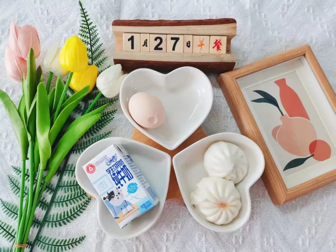 牛奶、小笼包、煮鸡蛋