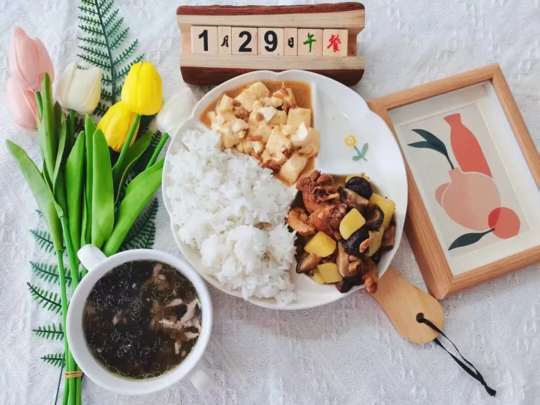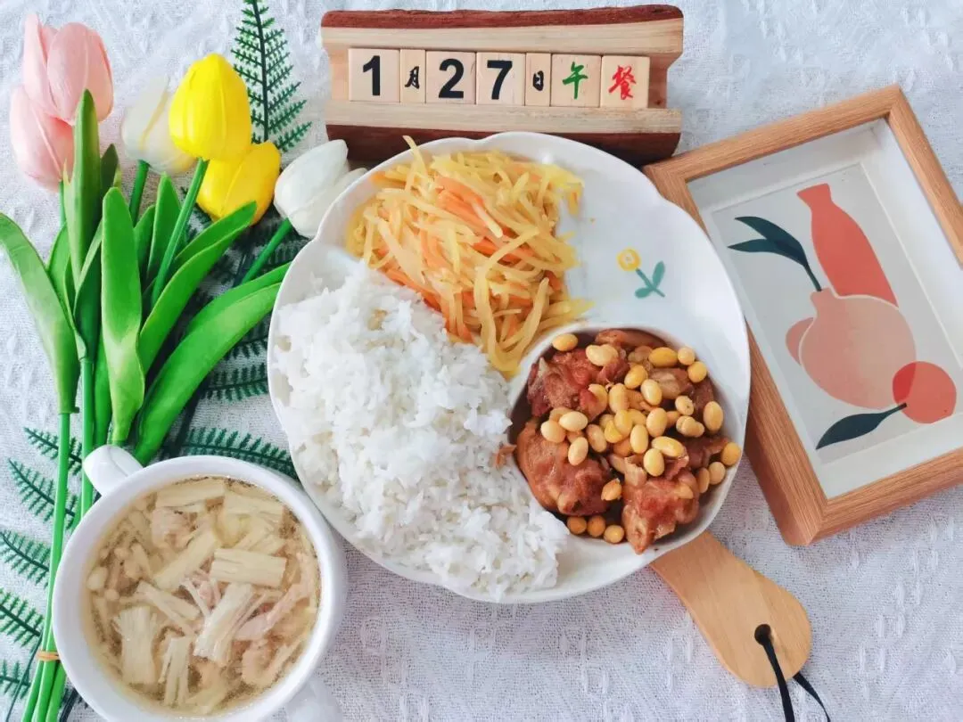 米饭、三鲜汤、黄豆焖猪蹄、蒜香土豆丝