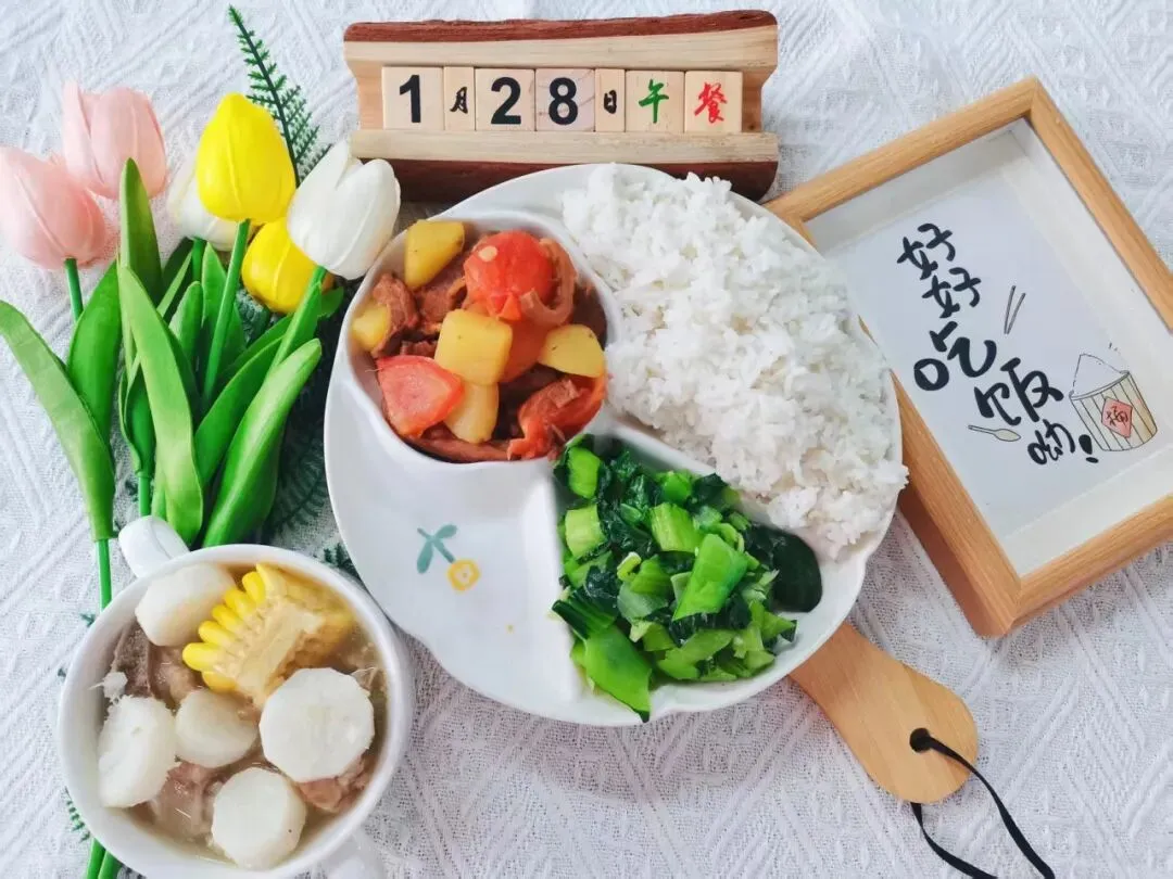 米饭、玉米山药排骨汤、西红柿土豆炖牛腩、素炒小青菜