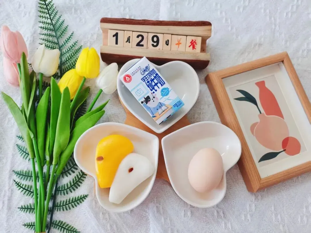 牛奶、双色糕、煮鸡蛋