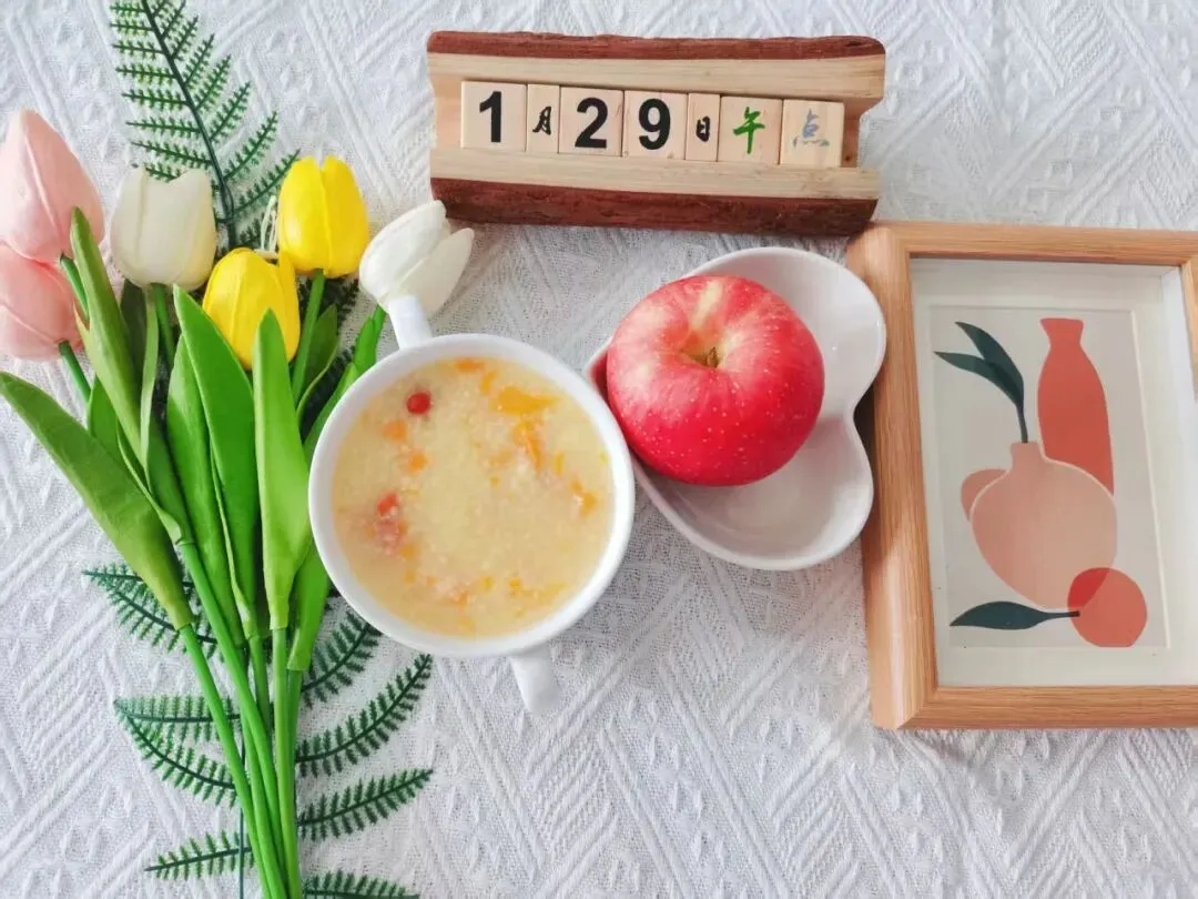 南瓜枸杞小米粥、苹果