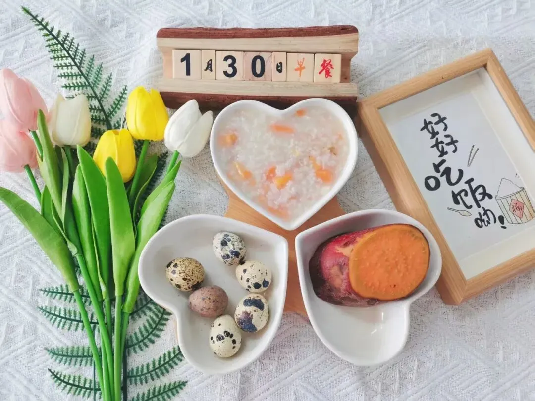 山药胡萝卜瘦肉粥、蒸红薯、鹌鹑蛋