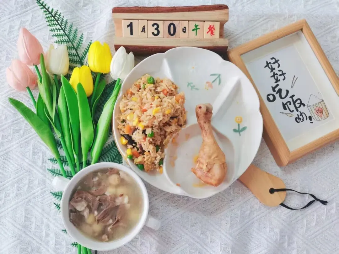 米饭、猪心莲子汤、五彩饭、红烧鸡腿