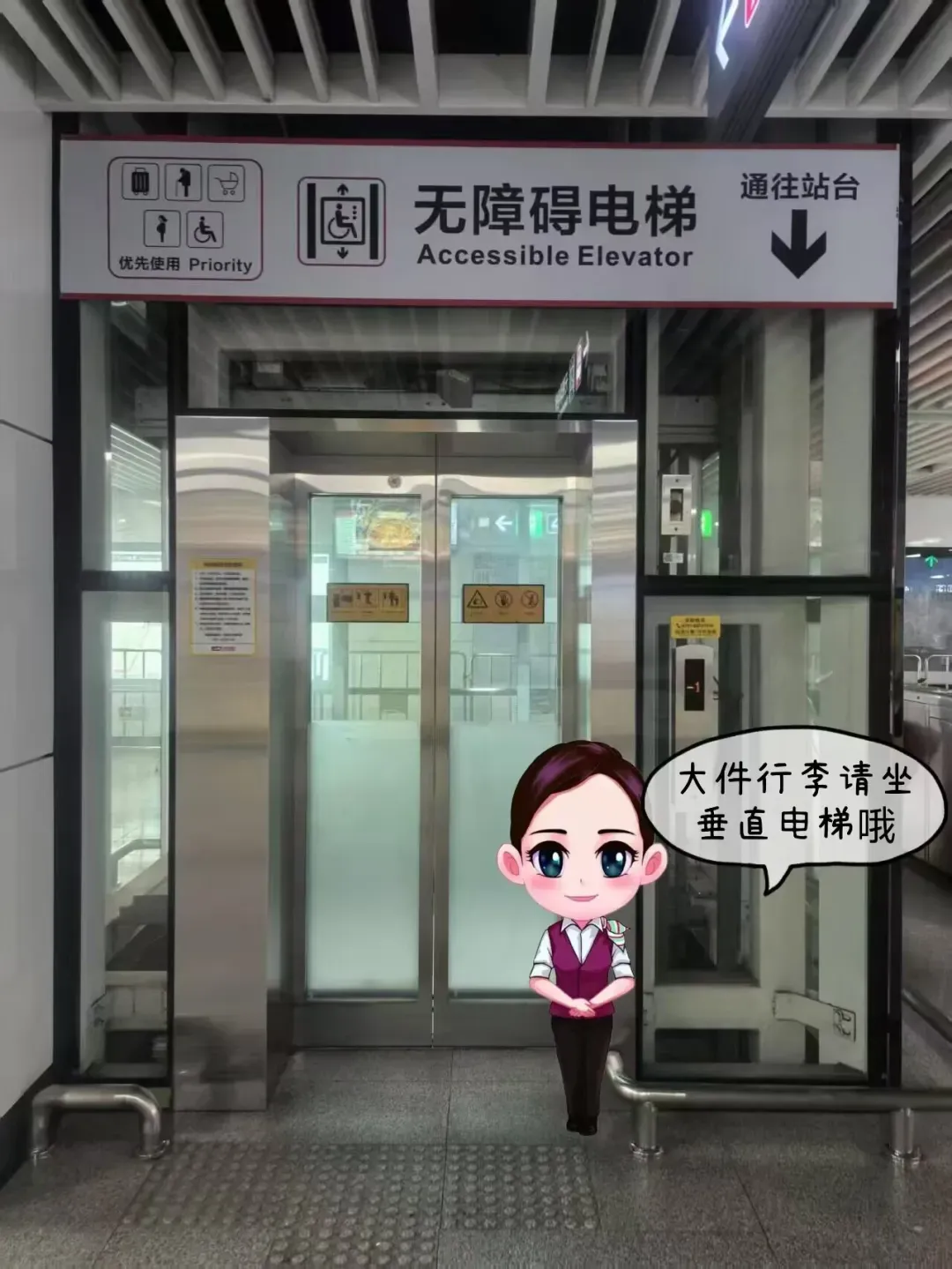 3️⃣ 大件行李乘直梯:请优先使用垂直电梯,安全省力;