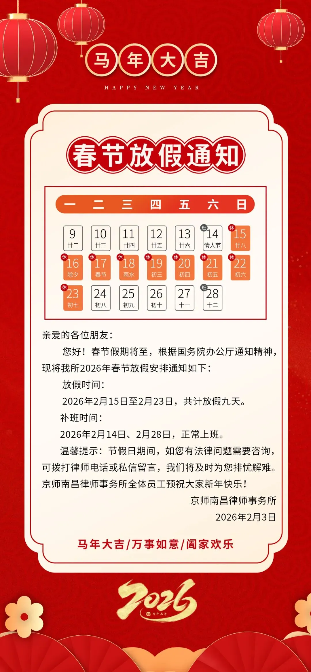 北京市京师(南昌)律师事务所2026年春节放假通知