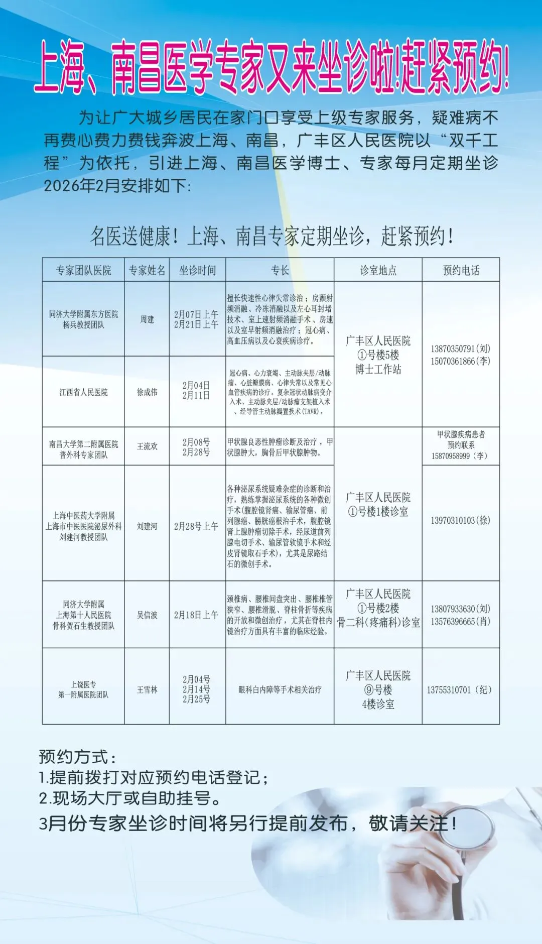 上海、南昌医学专家2026年2月份坐诊安排出炉了,为了您和家人的健康,请收藏并转发。(双击下图查看详细信息)