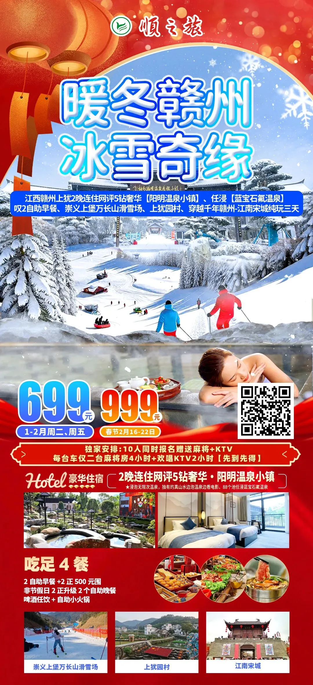 2月19/20日出发!春节999元赣州十星之旅!五星温泉+滑雪+自助晚餐一站式满足,豪住2晚五星阳明温泉酒店、畅泡88个蓝宝氟泉!纯玩3天!