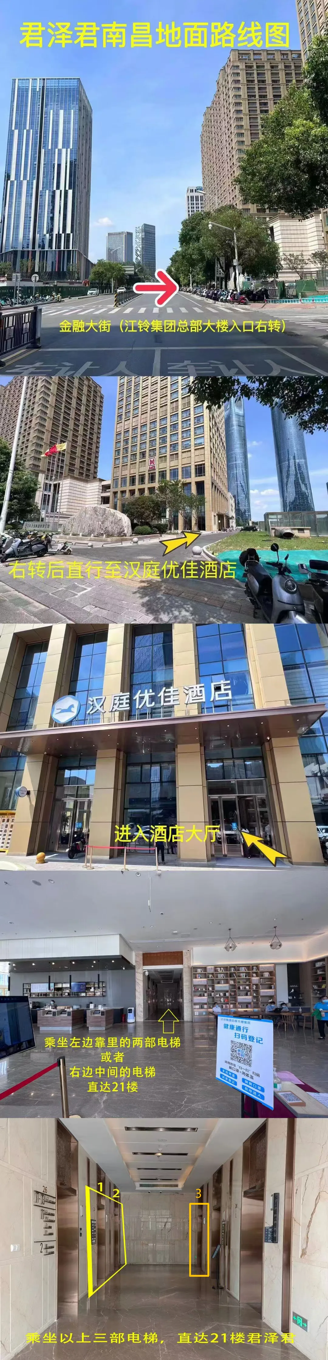 ②从万象天地入口进入,停至负2楼停车场,前往江铃集团电梯厅乘坐电梯,到达1楼后,再乘坐C2C3C6电梯到达21楼。