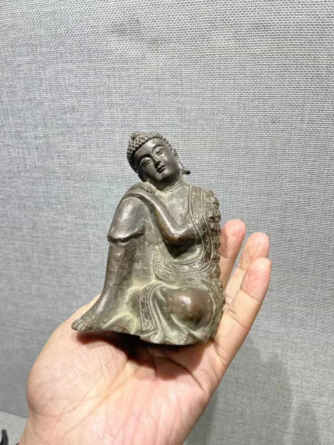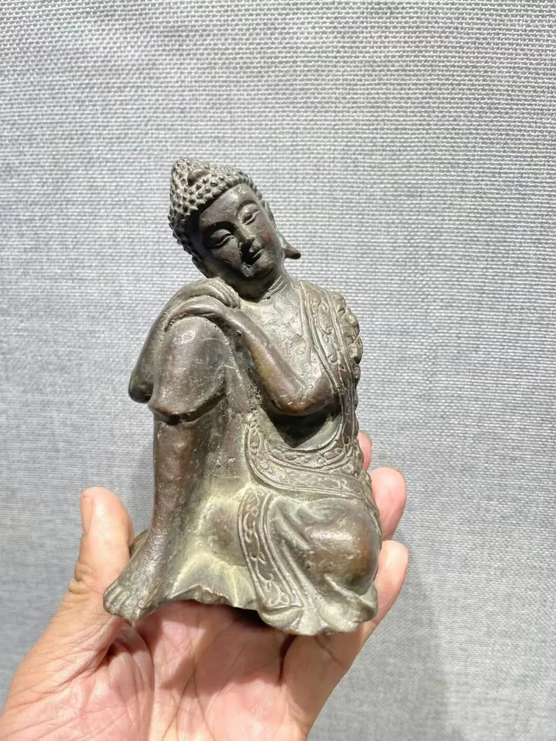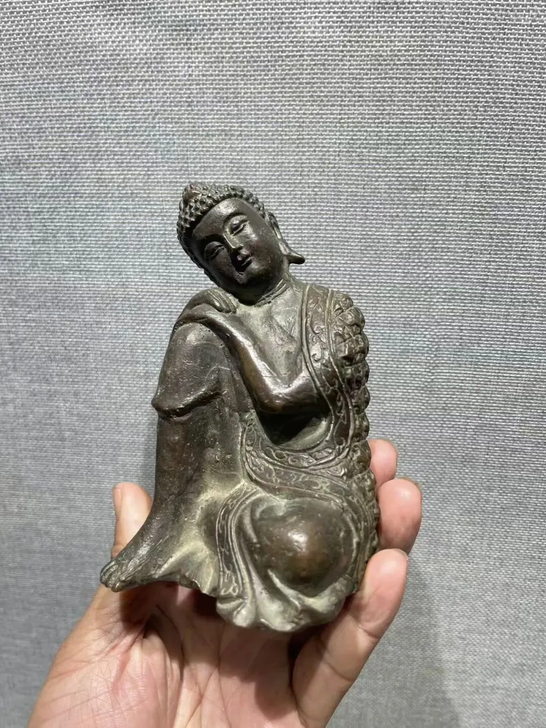 仔细观察以后,这是一件清代思维佛,单膝盘卧朝上双手扶于膝盖脸庞侧旁,好似猜想宇宙的万物世界,十分巧妙。