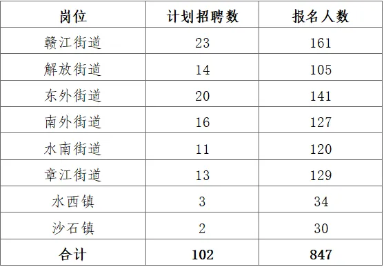 赣州市章贡区2026年社区工作者(专职网格员)招聘报名期间,1月29日至2月3日每天公布一次报名人数(数据截止每日17:00),之后不再公布报名人数。现将截至2月3日报名人数公布如下: