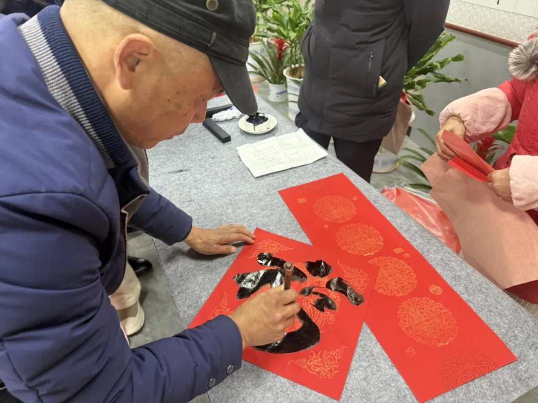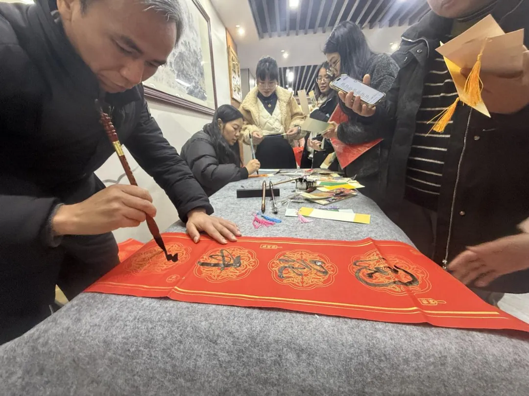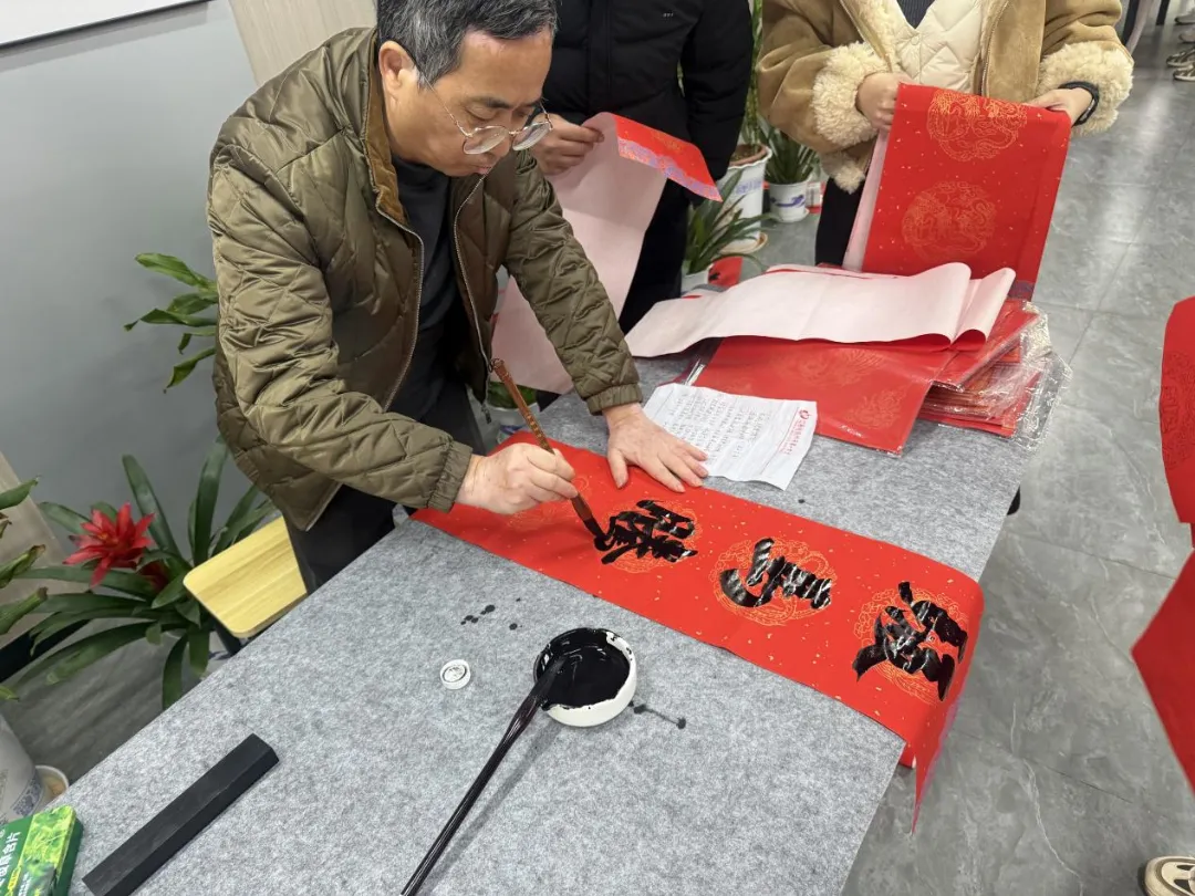 活动现场暖意弥漫、墨香萦绕,大红宣纸铺陈有序,笔墨砚台一应俱全,洋溢着浓郁的年节氛围与深厚的文化气息。书法特长师生专注凝神、挥毫书写,楷书尽显端庄之态,行书展现流畅之姿,隶书散发古朴之韵,一幅幅吉祥如意的春联、一张张饱含温情的“福”字跃然于纸上,承载着对家国、学业以及校园发展的美好期许。校领导驻足观赏同学们的作品,给予高度评价,并与师生交流书法技艺,为活动增添了庄重而温馨的氛围。