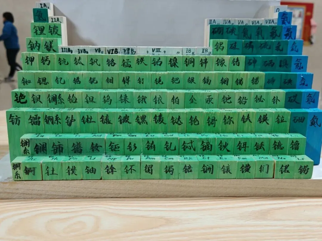 有的用废旧纸板、小木块、黏土、泡沫塑料搭建“立体周期表”,每一格都标注着元素符号、原子序数与关键性质,兼具实用性与环保理念;