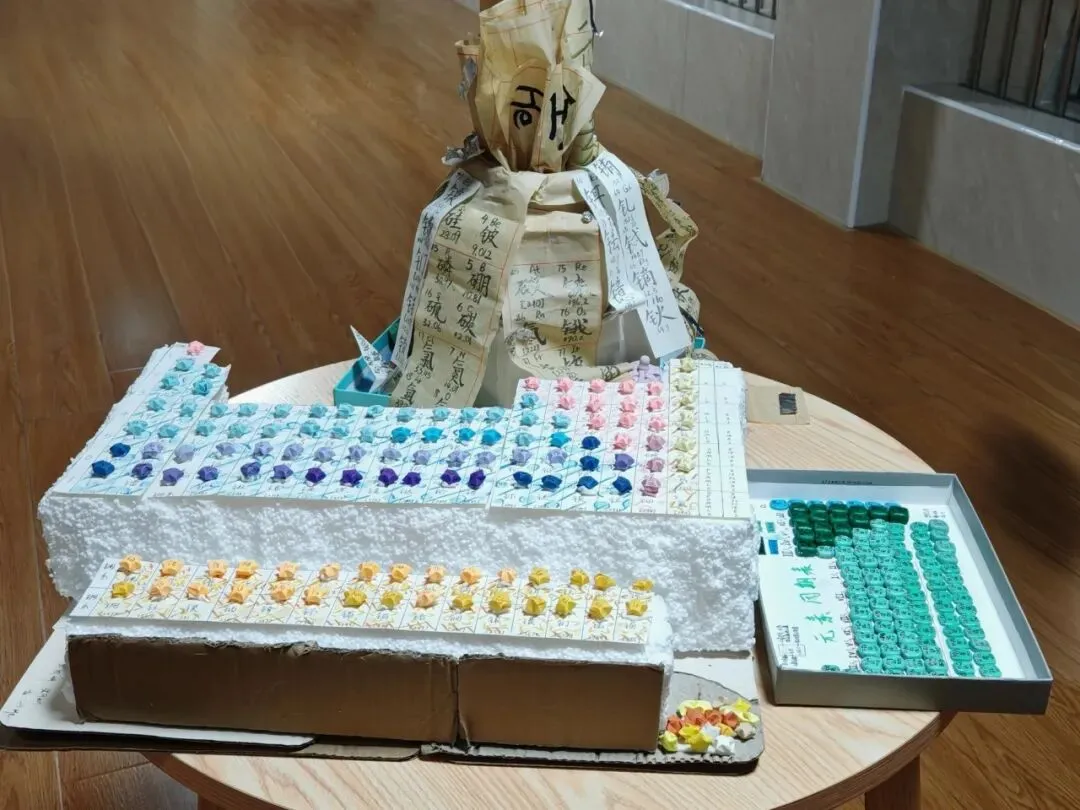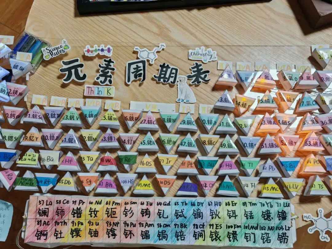 从材料选择到结构设计,从数据核对到细节装饰,同学们全程分工协作,将化学知识与动手能力、创新思维完美融合,每一件作品都凝聚着团队和个人的智慧与汗水。一张周期表,承载着化学世界的奥秘;一双双巧手,编织着少年们的科学梦想。