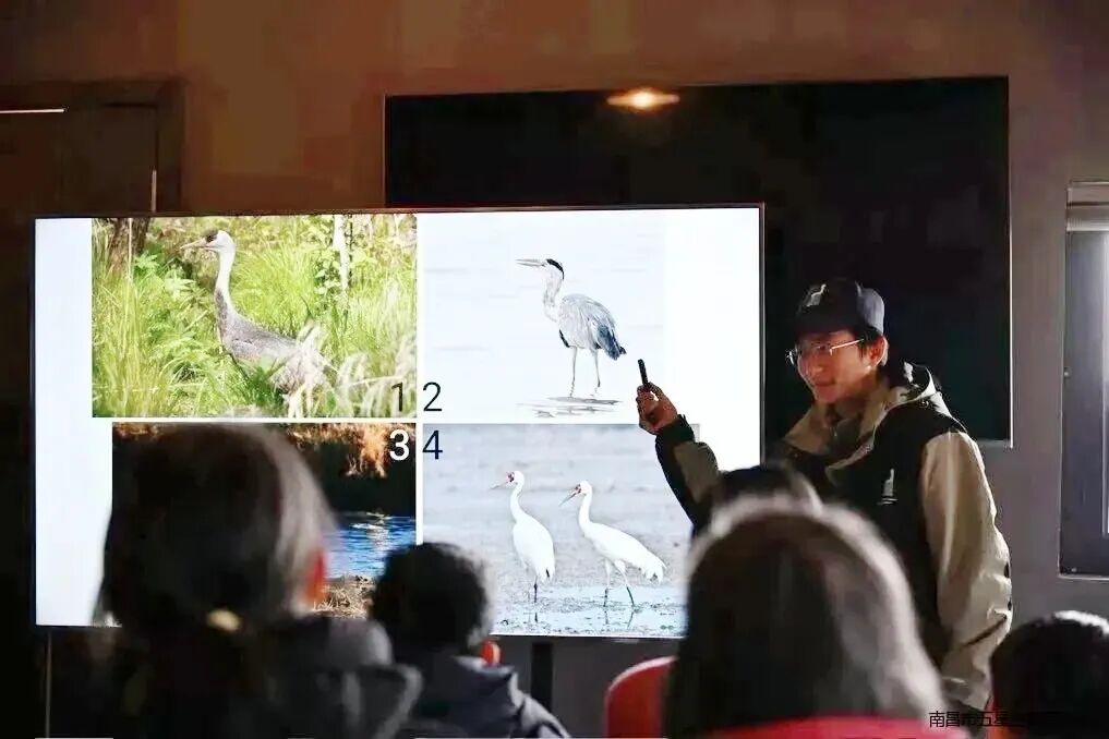 鹤类科普小课堂为整场活动拉开序幕。工作人员借助图文、视频等形式,用幽默风趣的语言,讲解了鹤类外形、习性、文化记载及生存现状,并融入湿地生态传统知识,介绍鄱阳湖越冬候鸟的种群与栖息情况。互动环节中,大家踊跃参与问答,面对“白鹤喜欢吃什么”的提问,纷纷抢答,有人说小鱼、有人说水草。工作人员介绍:“白鹤可是个‘素食爱好者’,比较爱吃苦草、莲藕等水生植物的根茎,就像我们爱吃清脆的马蹄一样。不过它们偶尔也会吃些小鱼小虾补充体力”。现场氛围轻松热烈,让大家在趣味交流中加深了对候鸟与湿地生态的认识。