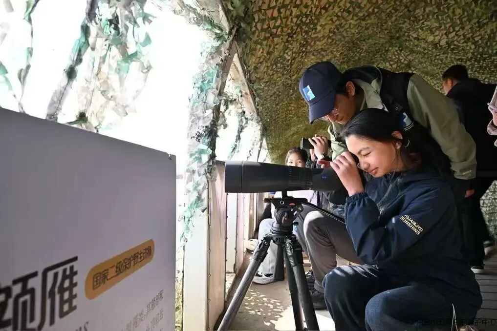 随后,大家前往保护小区2号摄影棚,开启沉浸式观鸟体验。在观鸟前,工作人员现场与大家分享观鸟时的注意事项,示范望远镜使用技巧,讲解鸟类观察要点,以帮助大家更好地捕捉鸟类的精彩瞬间。在工作人员的细心指导下,大家屏息静赏、轻声交流,纷纷拿起望远镜,观赏“鹤舞五星”的优雅画面。大家还来到白鹤共生馆,踏上探秘之旅。讲解员依托图文展板、迁徙路线剪影墙、生态艺术装置等丰富的展陈载体,进一步为大家讲解白鹤的特性、迁徙路线。在迁徙路线剪影墙前,讲解员指着墙上的路线图,生动地讲述着白鹤每年从遥远的西伯利亚到鄱阳湖越冬跨越千里的艰辛旅程,让大家对白鹤的坚韧与顽强有了更深刻的认识。