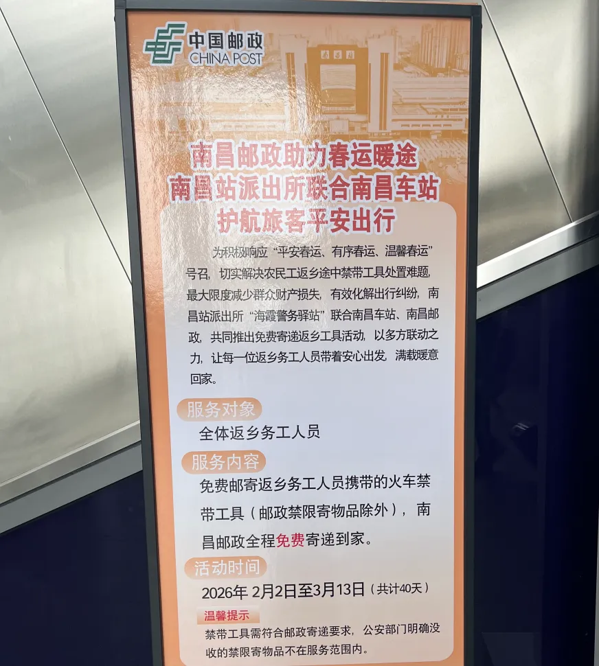 今年,南昌站派出所“海霞警务驿站”联合南昌车站、南昌邮政共同延续这项暖心服务,在2月2日至3月13日期间,继续为返乡务工人员提供禁限带工具的免费寄递服务。