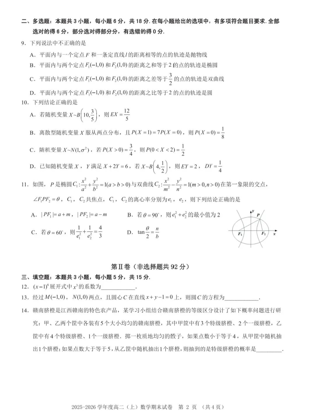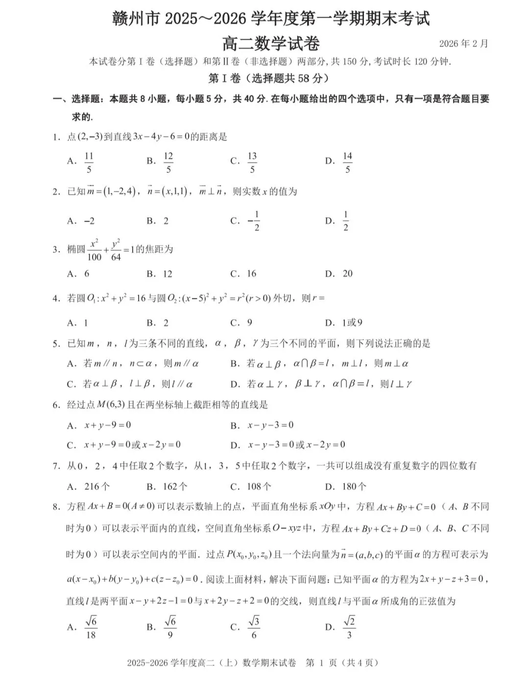 赣州市2025-2026学年度高二第一学期期末数学试卷分析
