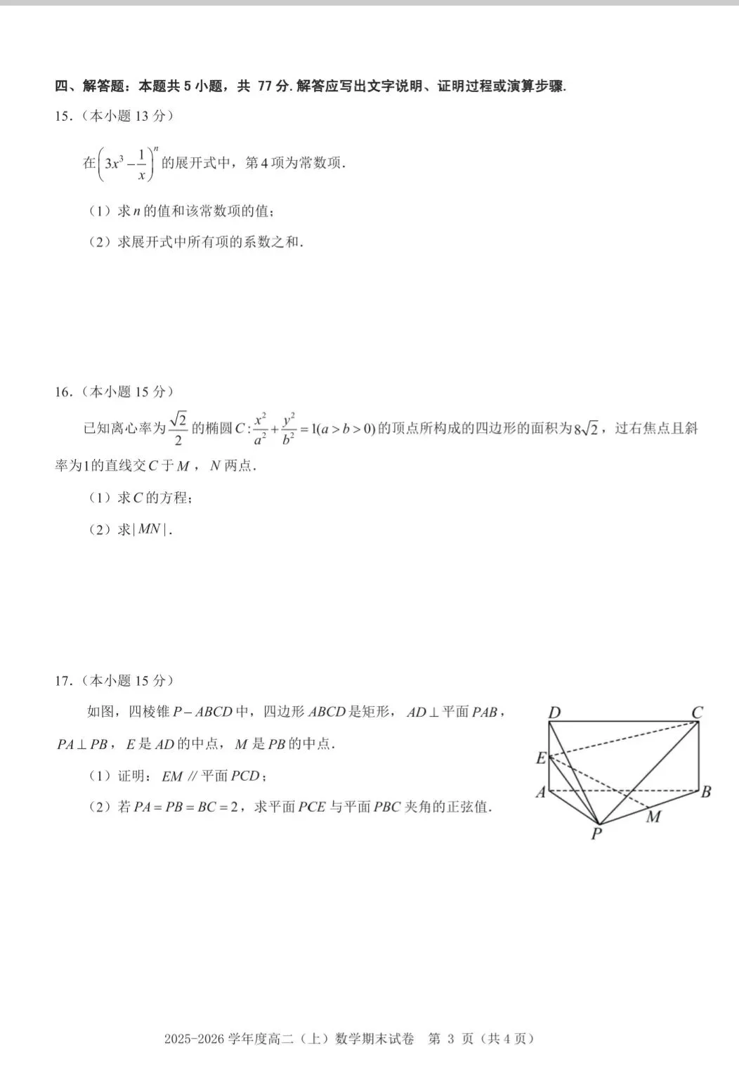 (四)解答题(共5小题,共77分)