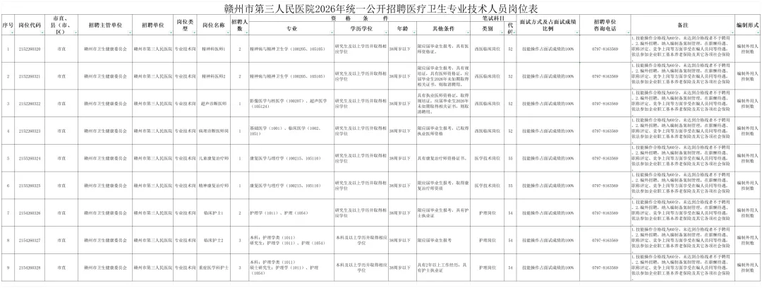 本次我院招聘计划共17名,具体招聘岗位及要求详见《赣州市第三人民医院2026年统一公开招聘工作人员岗位表》(附件1)、《赣州市第三人民医院2026年统一公开招聘医疗卫生专业技术人员岗位表》(附件2)(附件1、2,以下简称《岗位表》)。