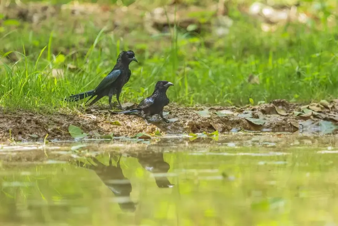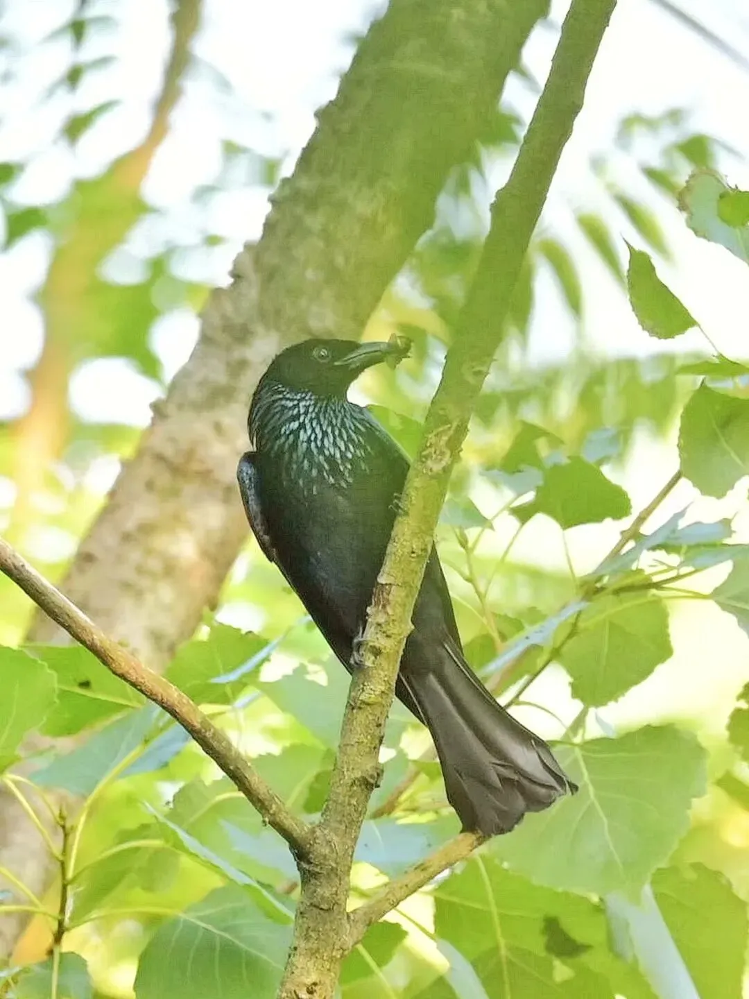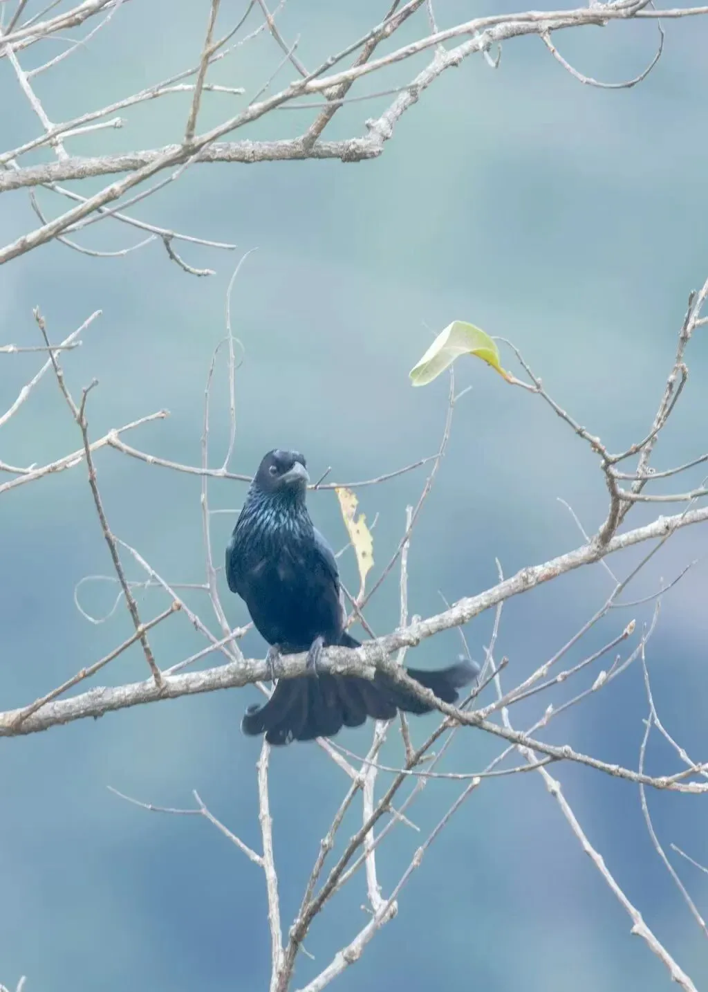 发冠卷尾最独一无二的特征,就是它前额上那撮细长而富有光泽的丝状羽。平时这撮羽毛会向后平伏,看起来只是一个不起眼的小冠。但当它兴奋、警戒或求偶时,这撮羽毛会立刻像钢针一样高高耸立,形成一个醒目、前冲的羽冠,这让它的侧影看起来非常酷炫、神气活现,像极了梳着“莫西干头”的摇滚明星,因此也被观鸟者昵称为“朋克鸟”。
