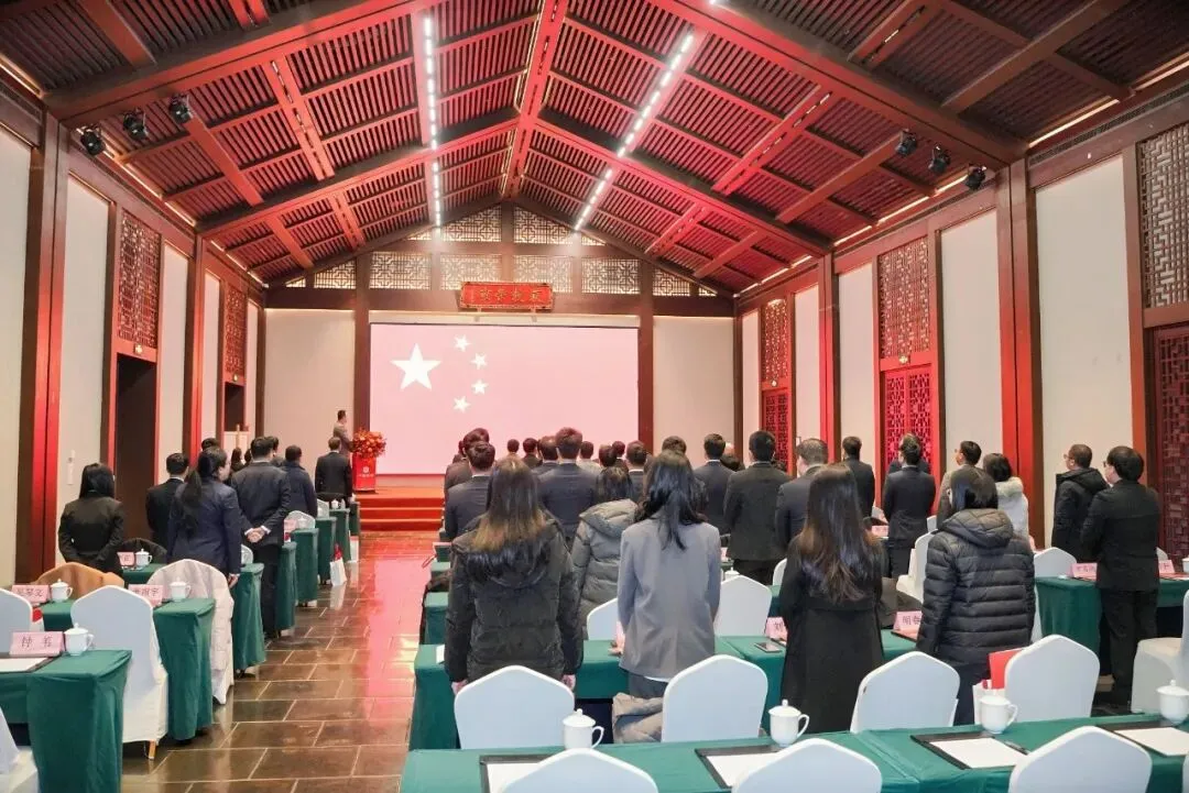 下午14时,年会正式拉开帷幕。在庄重的国歌奏唱声中,全体参会人员以饱满的精神状态开启了年度复盘环节。