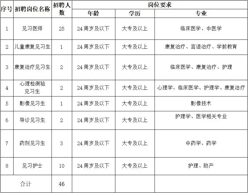 因医院发展需要,现招募高校毕业生46名参加就业见习,具体要求如下: