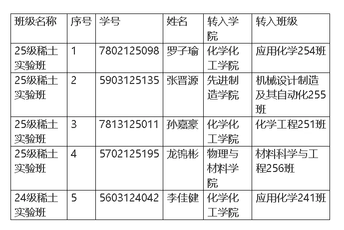 根据《南昌大学稀土实验班拔尖人才选拔、优补与退出实施细则》相关规定,现有化学化工学院稀土251班罗子瑜同学存在所修课程未一次性通过的情况,稀土241班李佳健、稀土251班张晋源,孙嘉豪等三位同学学习适应能力不足,稀土251班龙锦彬同学申请退出稀土实验班, 经学院审议,并报教务处审核批准,同意学生转入相关学院专业班级学习。现将班级调整情况公布如下: