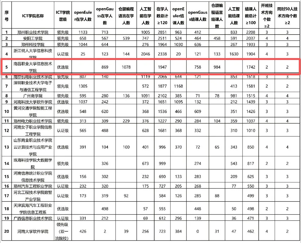 2026年2月2日,2025年华为ICT学院千校万里行——基础软件百校种子计划评选结果正式揭晓,南昌职业大学华为ICT学院凭借卓越的人才培养成效,成功入选“优秀ICT学院”名单,在全国900余所参与高校中位列第五,彰显了我司在基础软件人才培养领域的强劲实力与产教融合的深厚积淀。